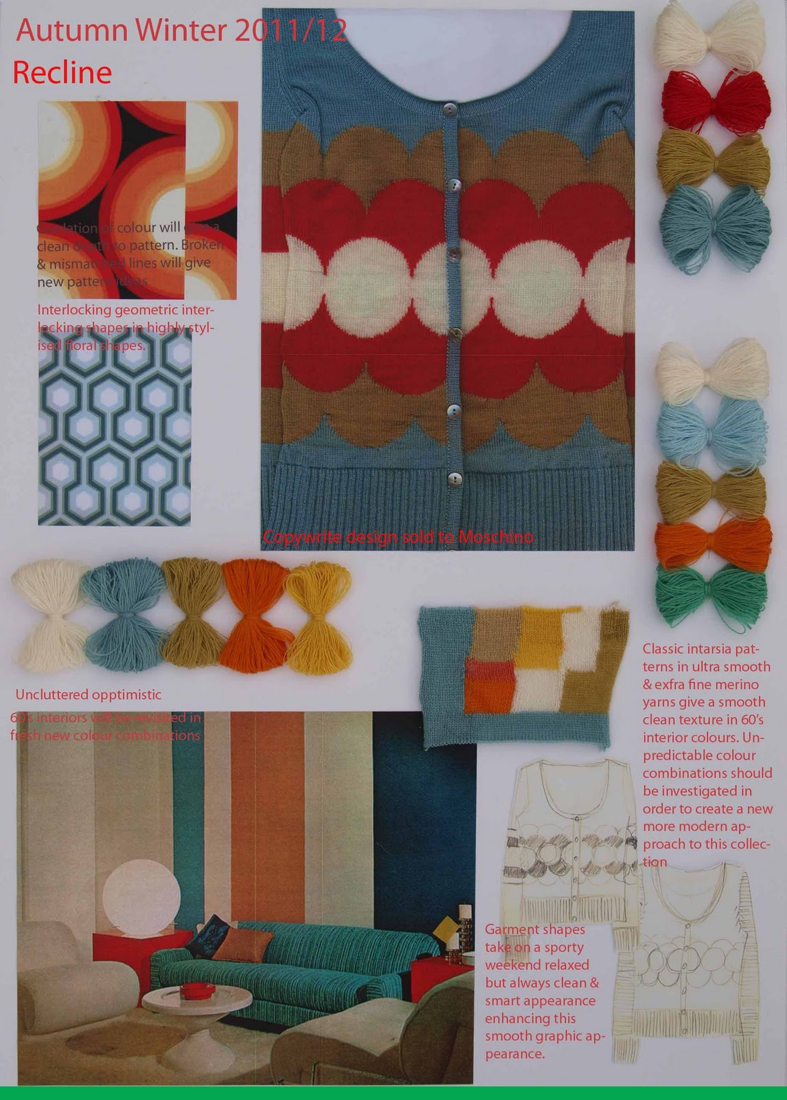 Well I have had a great week seeing my design on line in Moschino www.moschino.com look under women’s knitwear, scroll down to row 6. The design I sold is the first on the left look at the image above-does it look familiar? It’s now blue ground with red black & cream circles across the chest instead of the colours in the design above. I guess I will let them off for this. It’s £355.